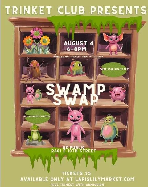 Join us for our biggest swap yet! Dive into the murky magic of Swamp Swap, a special trinket exchange night hosted by Trinket Club. Bring your swamp-themed trinkets — weird, wild, and wonderfully collectible — and trade with fellow collectors, creators, and curious minds.
